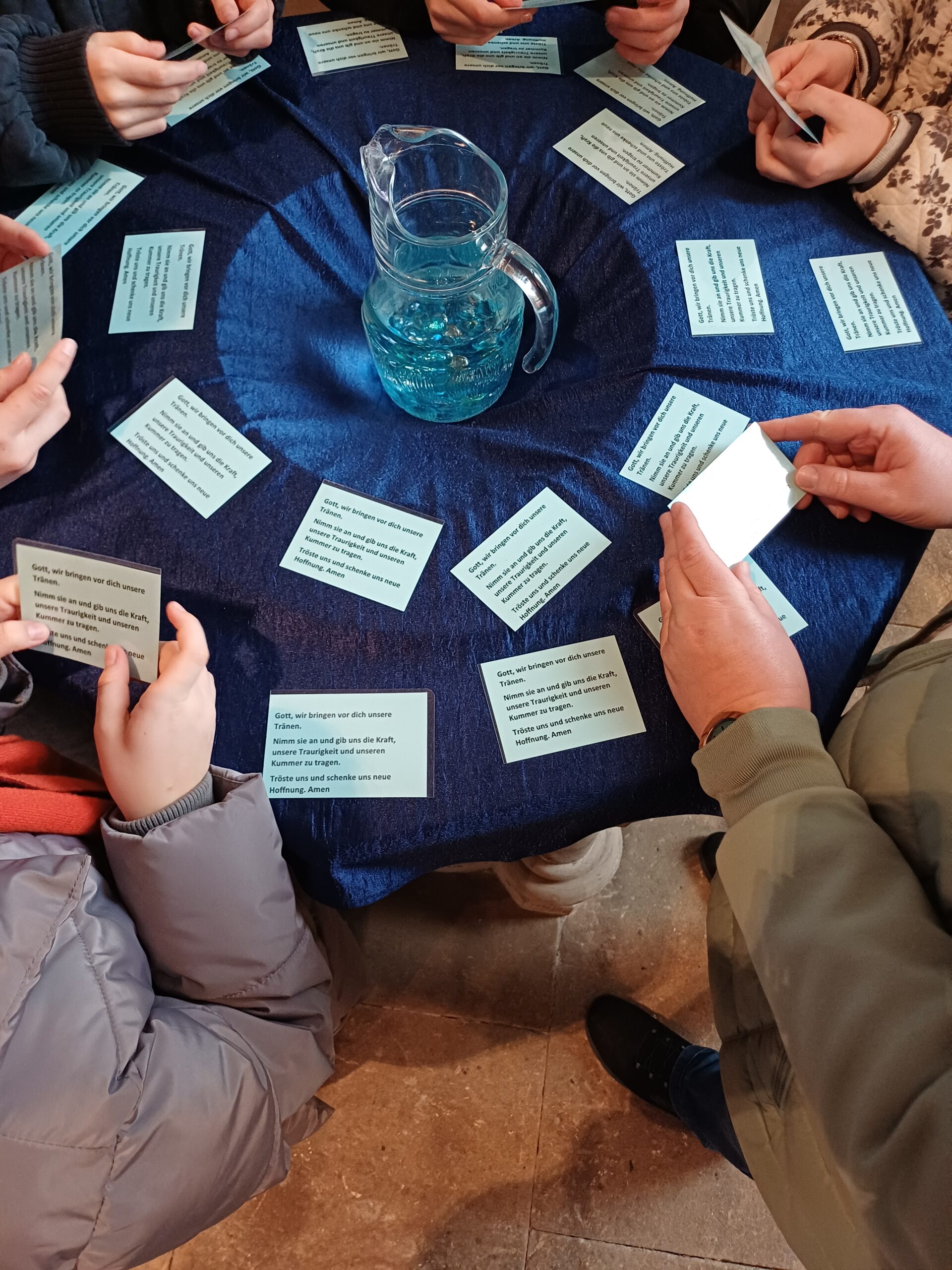 Der Stationenweg bot zudem zahlreiche Möglichkeiten zur aktiven Beteiligung: Die Kinder konnten Kerzen anzünden, von eigenen Vorstellungen erzählen oder Erinnerungskarten gestalten. So entstand ein geschützter Raum, in dem persönliche Gedanken, Erinnerungen und Gefühle ihren Platz fanden.