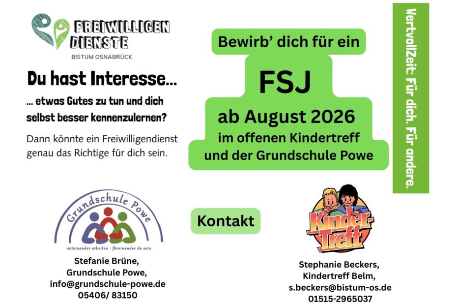 In unserer Kirchengemeinde kann man ein FSJ im offenen Kindertreff in Belm in Kooperation mit der Grundschule Powe absolvieren. Bei Interesse bitte melden bei:… Weiterlesen »Freiwilligendienst